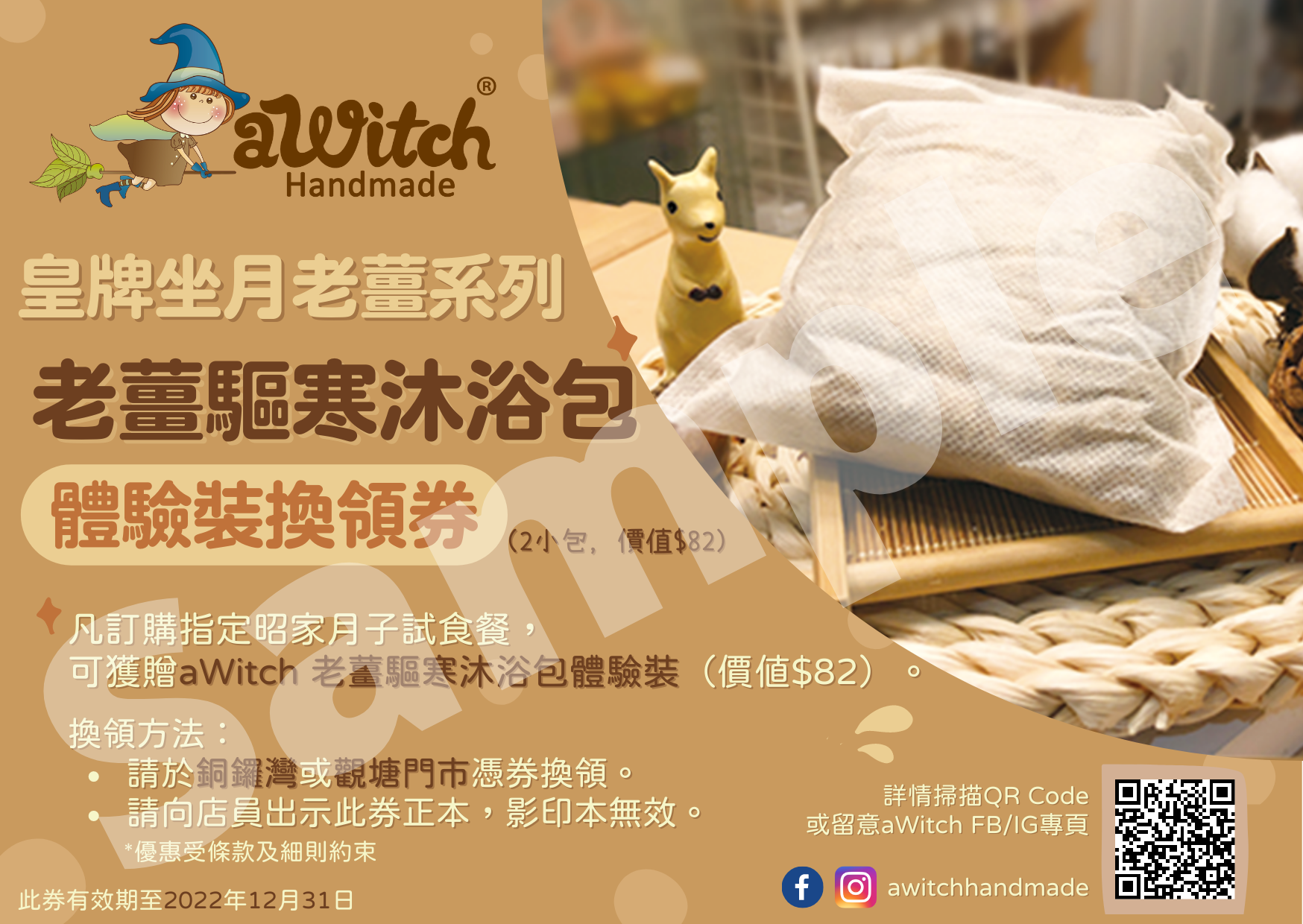 可獲贈 aWitch 老薑沐浴包體驗裝(內含2小包,每包可用2次,價值$82)